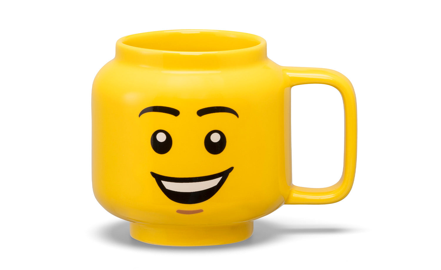 - Happy minifigure mug – This yellow ceramic mug is shaped and decorated like a, smiling LEGO® minifigure head
